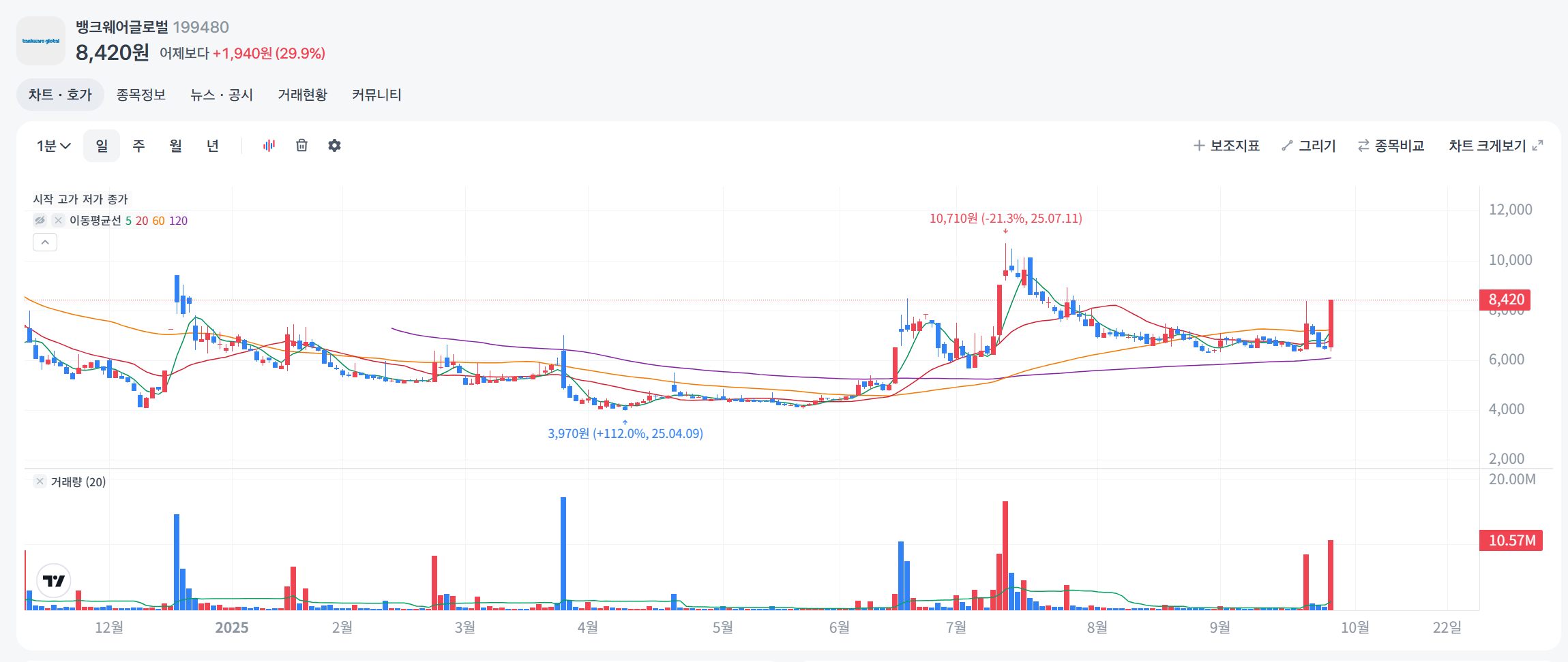 2025년 뱅크웨어글로벌은 실적 개선과 신제품 출시로 긍정적 뉴스가 많았습니다. 9월 25일, 블록체인 미들웨어 'BXB' 출시로 주가 상승을 이끌었으며, 1분기 실적에서 매출 26.7% 증가, 손실 44% 감소를 발표했습니다. 7월 25일, 주가 8,370원(+8.7%)으로 장중 상승하며 흑자전환 기대감을 반영했습니다. 부정적 이슈로는 2023년 영업손실 46억 원 지속과 해외 프로젝트 지연입니다.