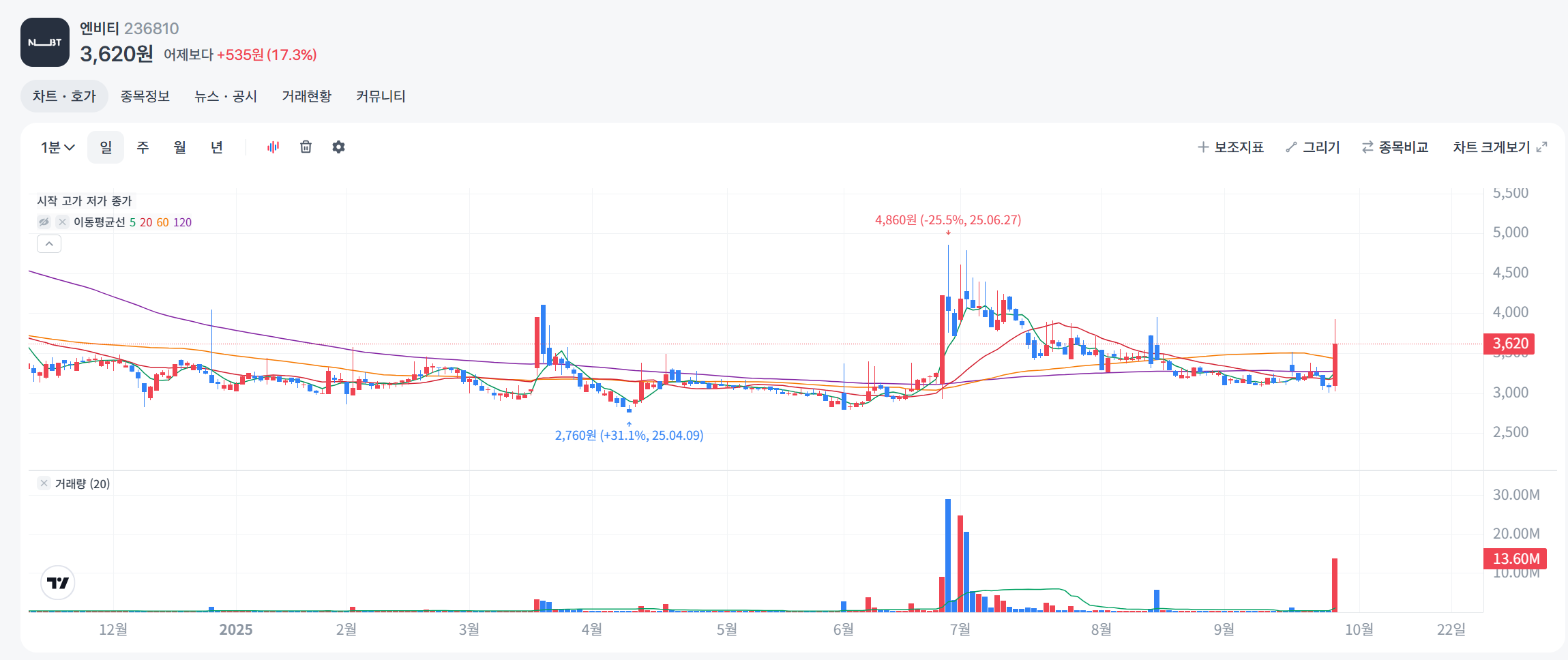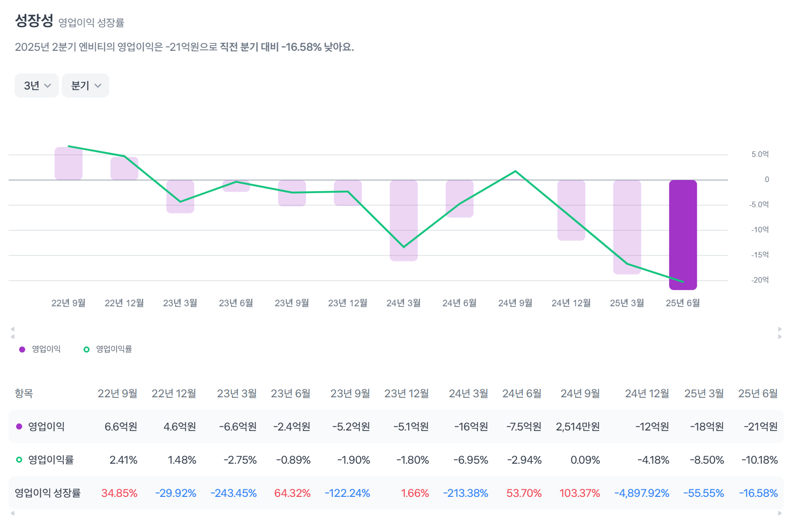 2025년 엔비티는 실적 개선과 신제품 출시로 긍정적 뉴스가 많았습니다. 9월 25일, CFO 인사이더 구매 소식으로 주가 상승을 이끌었으며, 1분기 실적에서 매출 26.7% 증가, 손실 44% 감소를 발표했습니다. '캐시슬라이드' 앱 글로벌 확대와 블록체인 'BXB' 출시로 디지털 광고 시장 진입을 노리고 있습니다. 부정적 이슈로는 2023년 영업손실 46억 원 지속과 해외 프로젝트 지연입니다.