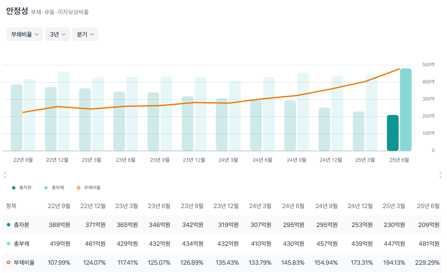 - 지속 손실(ROE -33.82%)과 부채비율 146%로 재무 불안정.