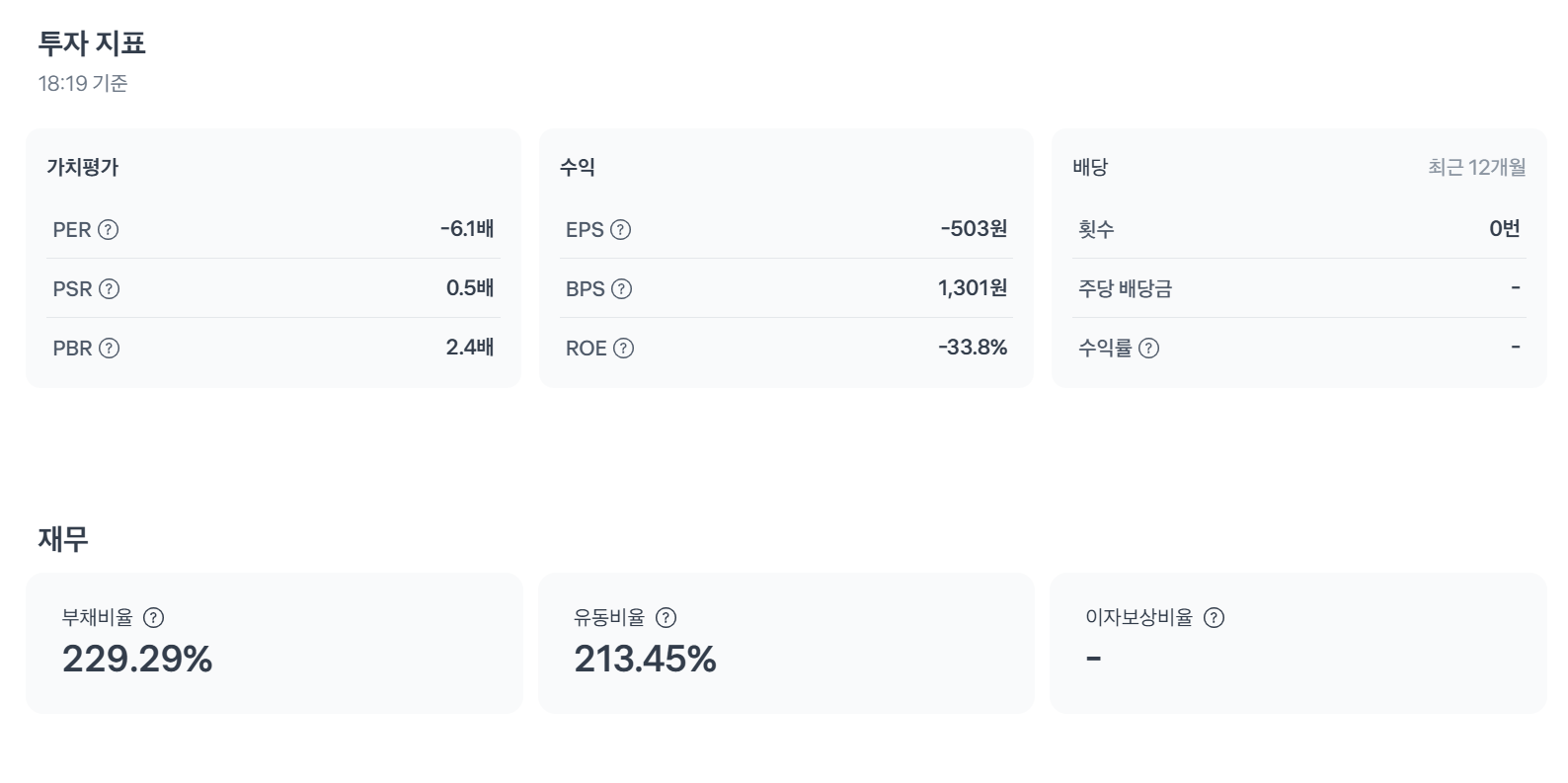 | EPS (1주당 순이익) | N/A | 주당 손실. 흑자 전환 시 상승 요인. |