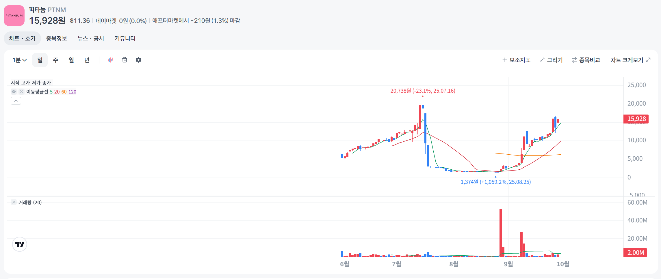 PTNM 주가는 2025년 7월 고점 후 8월 급락, 9월 반등으로 변동성 컸습니다. 7월 IPO 후 열기 $14.79 고점 찍었으나 8월 시장 조정으로 $0.98 최저까지 추락(-93% 수준). 9월 재무 발표로 회복, 9월 25일 +24.86% 급등($10.75) 후 26일 -14.41%($9.74) 조정. 전체 3개월 -34% 하락이지만, 거래량 증가로 모멘텀 회복 조짐.