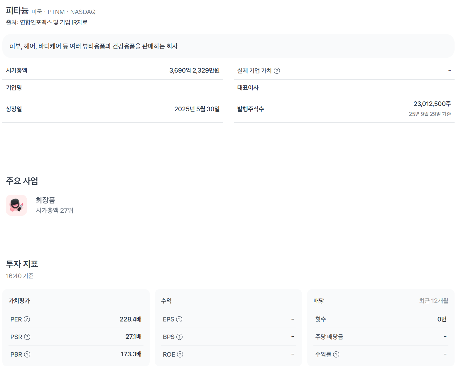 PTNM 재무는 흑자지만 고평가(PER 378배)로 리스크 큽니다. TTM 순이익 509만 달러로 안정적이나, PBR 157배처럼 자산 대비 과열. 부채비율 145%로 재무 부담, 매출 성장 데이터 부족하나 퍼스널 케어 시장 확대 기대.
