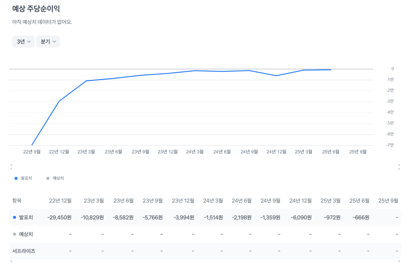 | PER (주가수익비율) | -0.04배 | 주가가 이익 대비 평가. 음수는 적자 상태, 턴어라운드 가능성 주목! |