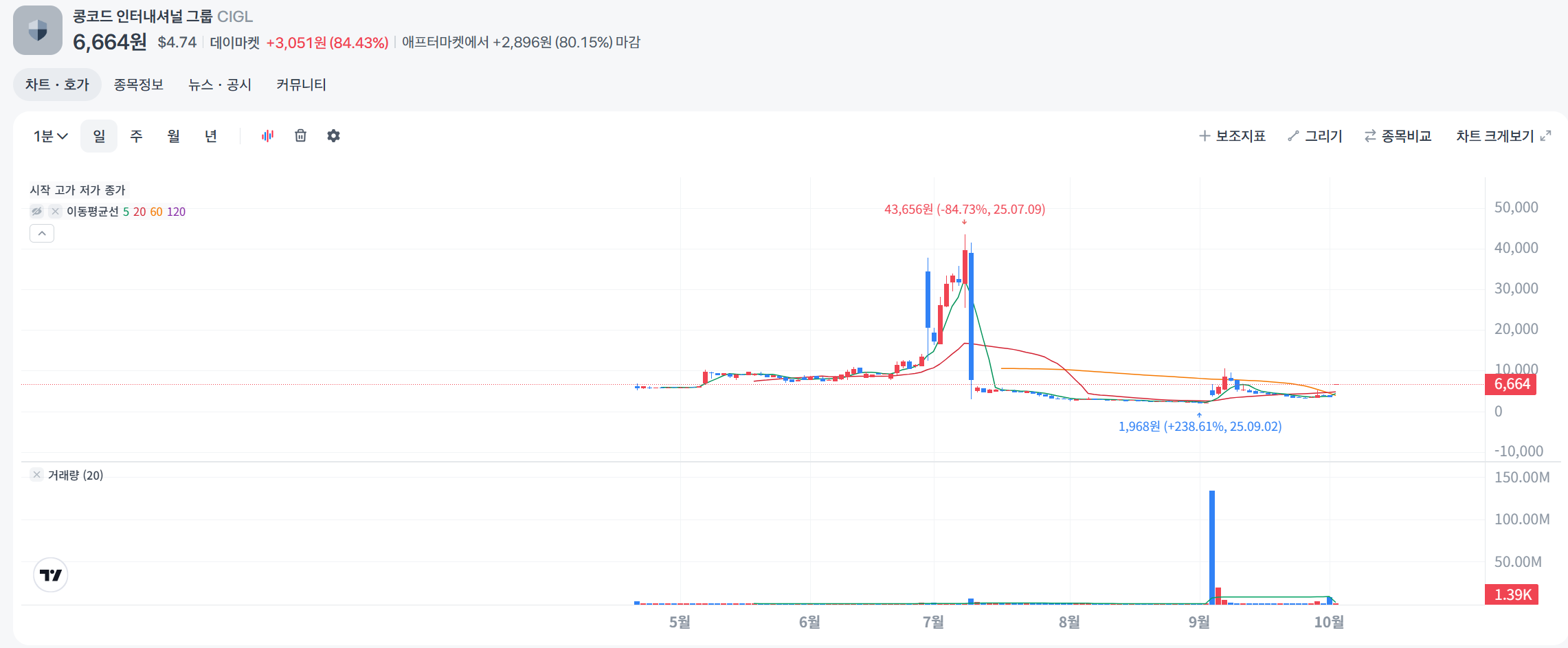 CIGL 주가는 2025년 7월부터 9월 말까지 저점 회복 후 호재 랠리를 보였습니다. 7월 초 92% 폭락 후 1.40달러 최저 찍고 안정, 8월 2~3달러대 보합, 9월 H1 실적 발표로 +80% 급등(9월 30일 AH $4.60대). 전체 -20% 하락 후 반등 조짐, 거래량 증가(9월 70k 주)로 모멘텀 강하나 불안정.