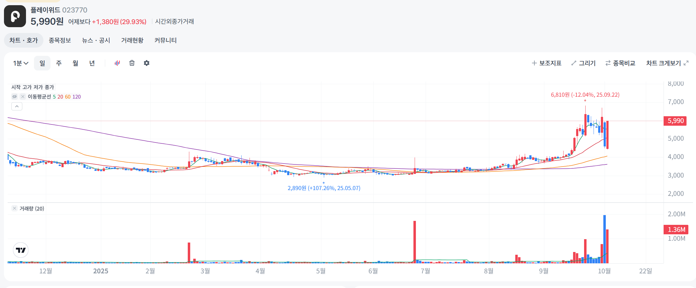 플레이위드 주가는 2025년 7월부터 9월까지 하락세를 보였으나, 10월 게임 론칭 호재로 상한가 폭등했습니다. 7월 4,000원대에서 시작해 8월 3,500원대로 하락, 9월 +52.24% 월간 상승 후 4,610원 종가. 10월 2일 상한가(5,990원)로 전체 3개월 +20% 상승, 거래량 폭증(111만 주)으로 모멘텀 강세지만, 소형 게임주 특성상 불안정.