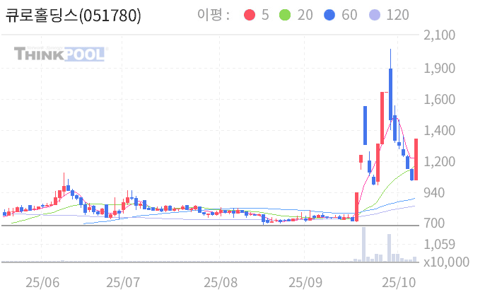 2025년 4월부터 10월 14일까지 051780 주가는 극심한 변동성을 보였어요. 4월 초 주가는 약 600-800원대에서 시작했지만, 시장 불안으로 하락해 6월 말 500원대로 떨어졌어요. 그러나 9월부터 모멘텀으로 반등, 10월 14일 상한가(+29.94%)로 1,341원을 기록했어요. YTD(올해 누적) 수익률은 부진하지만, 6개월 +63.55%로 최근 급등세.