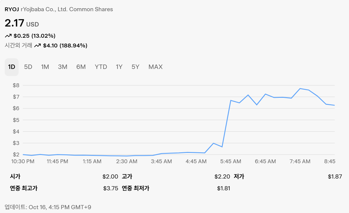 2025년 4월부터 10월 16일까지 RYOJ 주가는 변동성이 컸어요. 4월 초 약 $2.50-$2.80대에서 시작했지만, 시장 조정으로 7월 말 $2.20대로 하락했어요. 이후 8월 IPO 효과와 실적 개선 소식으로 반등, 10월 15일 종가 $2.17 (전일대비 +13.02%)을 기록했으며, 애프터아워스에서 $7.24까지 +234% 폭등 후 조정 중입니다. YTD(올해 누적) 수익률은 -42.13%로 부진하지만, 최근 1주일 +2.56%, 1개월 +1.01%로 안정적 상승세를 보이고 있어요. 상세한 가격 흐름은 위의 finance card에서 확인할 수 있습니다.