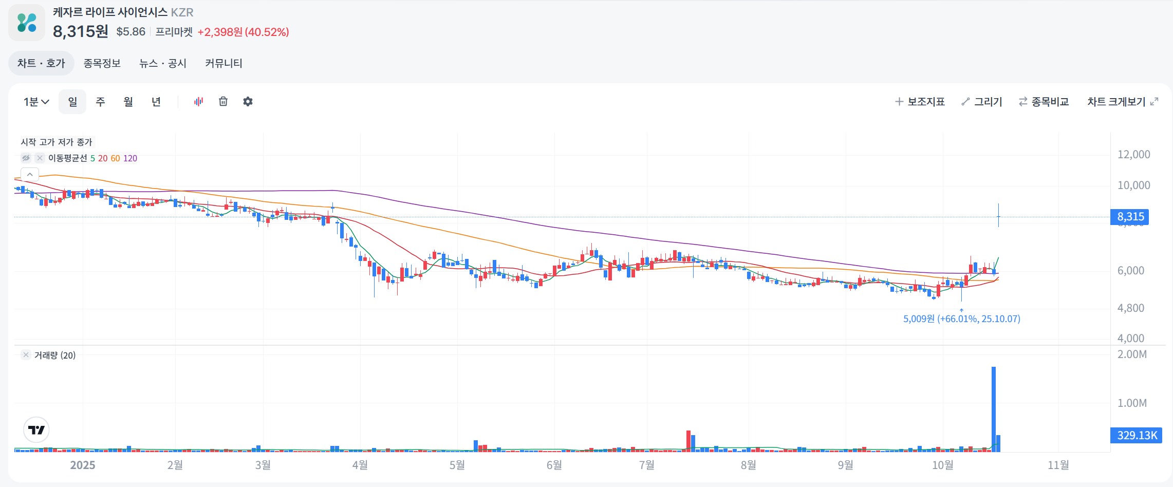 2025년 7월 17일부터 10월 17일까지 KZR 주가는 하락 추세를 보이다가 최근 뉴스로 급등했습니다. 전체적으로 -20% 정도 하락했으나, 10/16 close $4.17 후 AH +53% to $6.39로 반등.