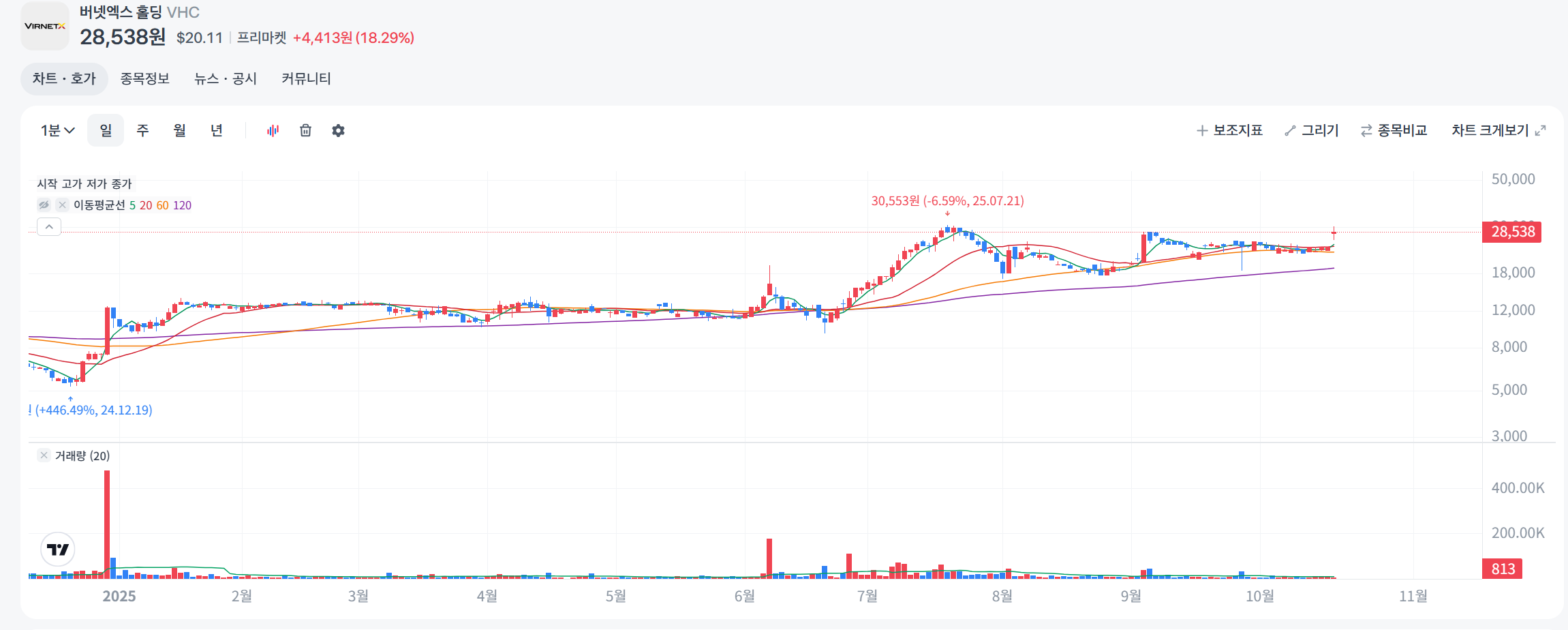 2025년 7월 17일부터 10월 17일까지 VHC 주가는 하락 추세를 보이다가 최근 GSA 계약 뉴스로 급등했습니다. 전체적으로 +124% 상승 (52주 기준)이지만, 3개월 내 변동 컸습니다. 10월 16일 +6.18% 상승.