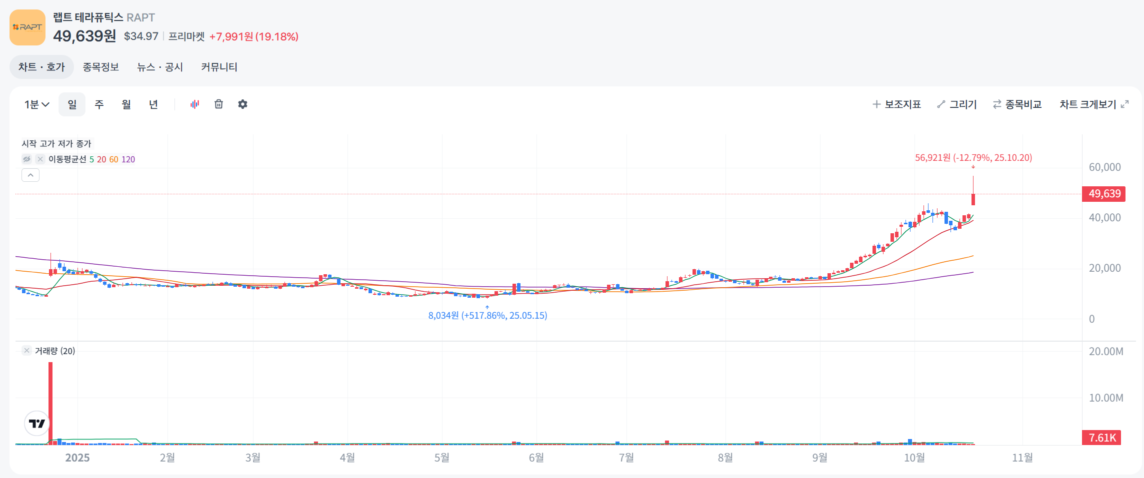 | 현금+유가증권(6/30/25) | $168.9M [rapt.com] |