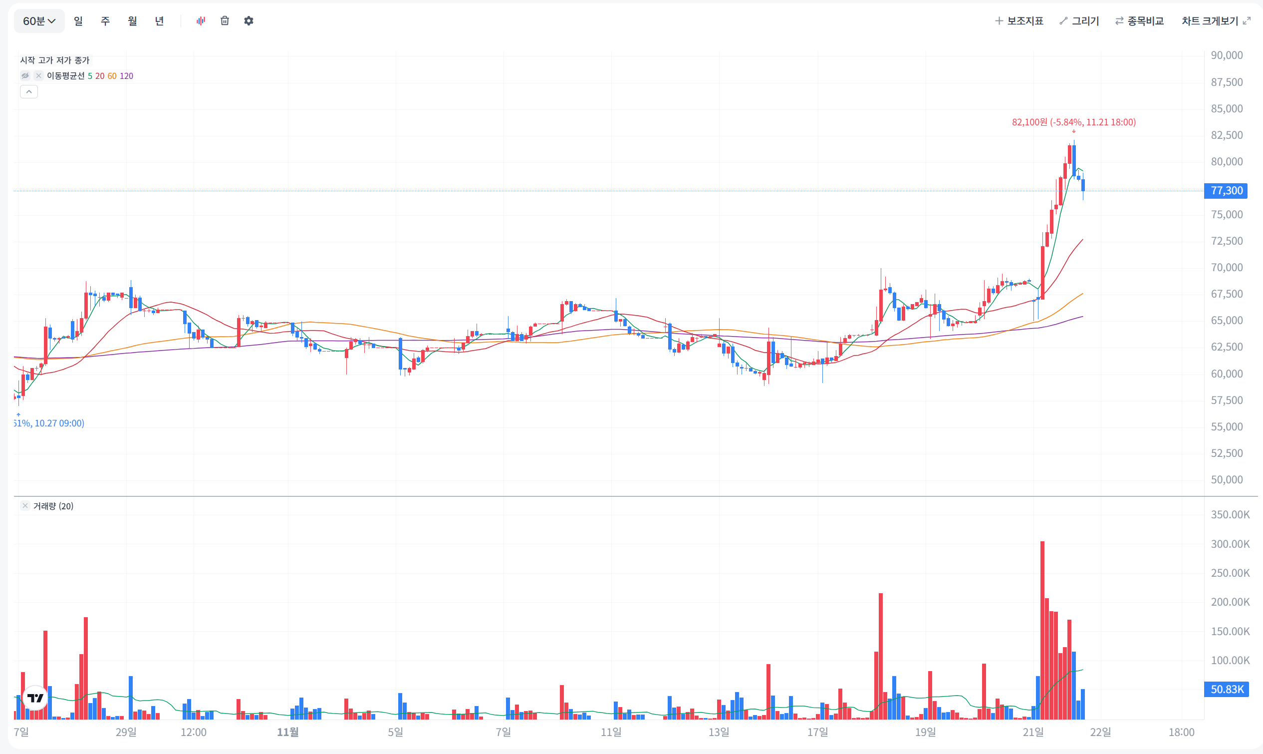 | 강력 지지선 | 50,000원 | 최근 거래량 지지 + 50일 이동평균 |