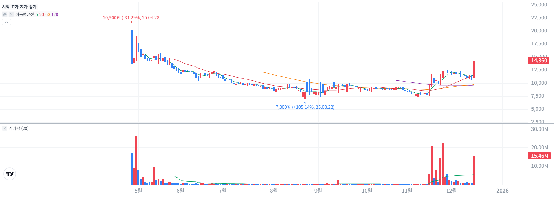 - 상장 이후 급등 → 박스권 횡보 → 최근 거래량 동반 우상향