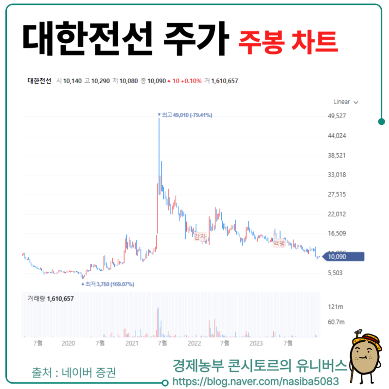 주가 차트를 살펴보면, 대한전선의 주가는 최근 몇 년간 큰 변동성을 보였어요. 현재 주가는 10,090원으로, 과거 52주 최고가는 49,010원이었고, 최저가는 3,750원이었어요. 이러한 차트는 투자자들에게 중요한 참고자료가 되죠.