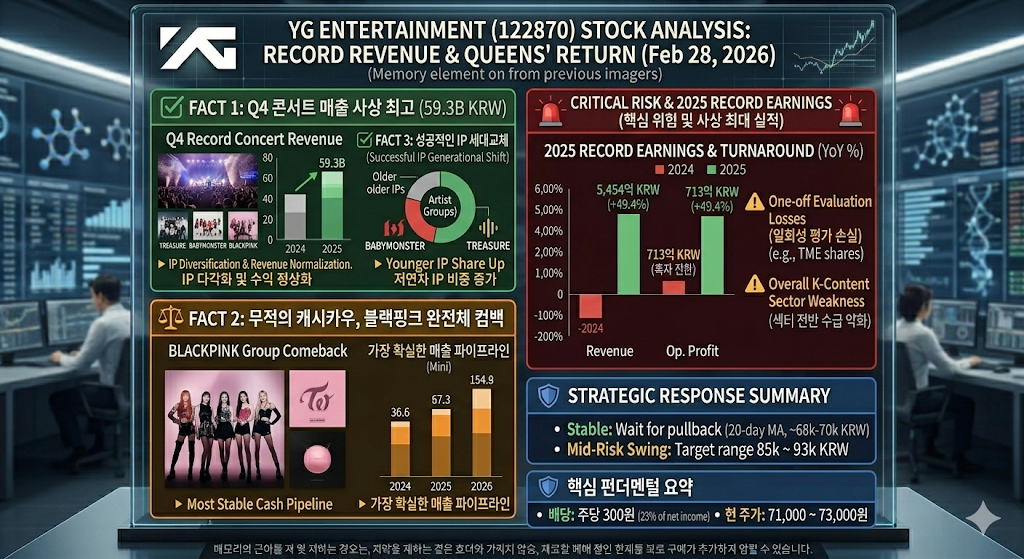 - 🛡️ 안정 추구형 (실적 기반 눌림목 매수): 2025년 실적 서프라이즈와 배당 공시는 확인되었습니다. 블랙핑크 컴백 뉴스 플로우에 따른 단기 차익 실현 매물이 나오며 주가가 20일 이동평균선(약 68,000원~70,000원 선) 부근으로 쿨다운(Cool-down) 될 때 진입하는 것이 정석입니다.