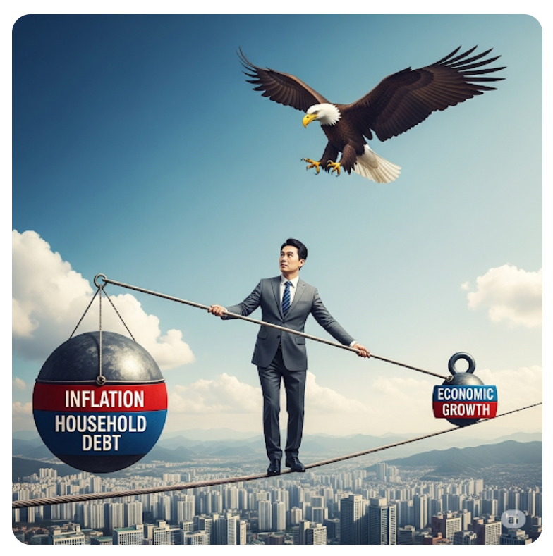 현재 한국은행은 '물가/부채 안정'과 '경기 부양'이라는 두 마리 토끼 사이에서, 그리고 '미국 연준의 눈치'라는 현실적인 제약 속에서 어려운 줄타기를 하고 있습니다.
