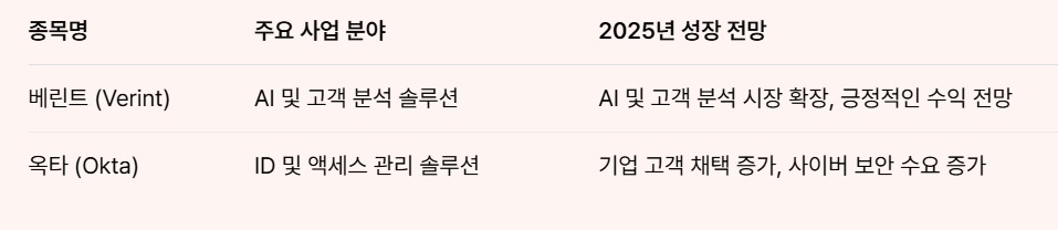 베린타(VRNT)와 옥타(OKTA)는 각각 데이터 분석과 신원 인증 솔루션을 제공하는 기업으로, 최근 기술주 시장에서 두각을 나타내고 있습니다. 이 두 기업은 뛰어난 성장 가능성과 시장에서의 안정성으로 많은 투자자들의 주목을 받고 있습니다. 특히, 옥타는 최근 수익성에 대한 긍정적인 전망으로 관심을 받으며, 베린타는 데이터 분석의 중요성이 증가함에 따라 시장에서의 입지를 강화하고 있습니다.