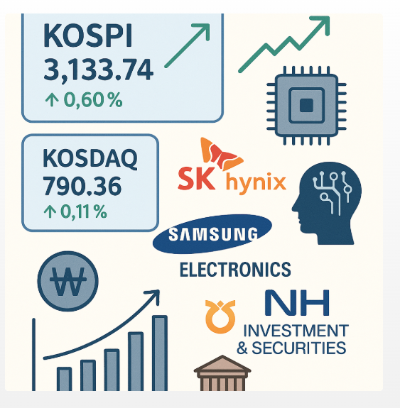 오늘 한국 증시는 코스피 3,133.74 (+0.60%), 코스닥 790.36 (+0.11%)로 상승 마감했습니다