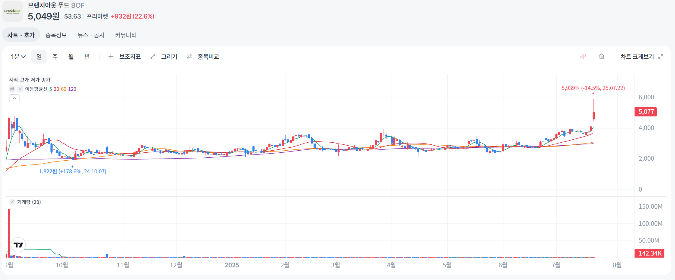 브랜치아웃푸드(BOF)는 소형주인 만큼, 1주일이라는 짧은 기간 동안 다음 요인들에 의해 큰 폭의 변동성이 나타날 수 있습니다:
