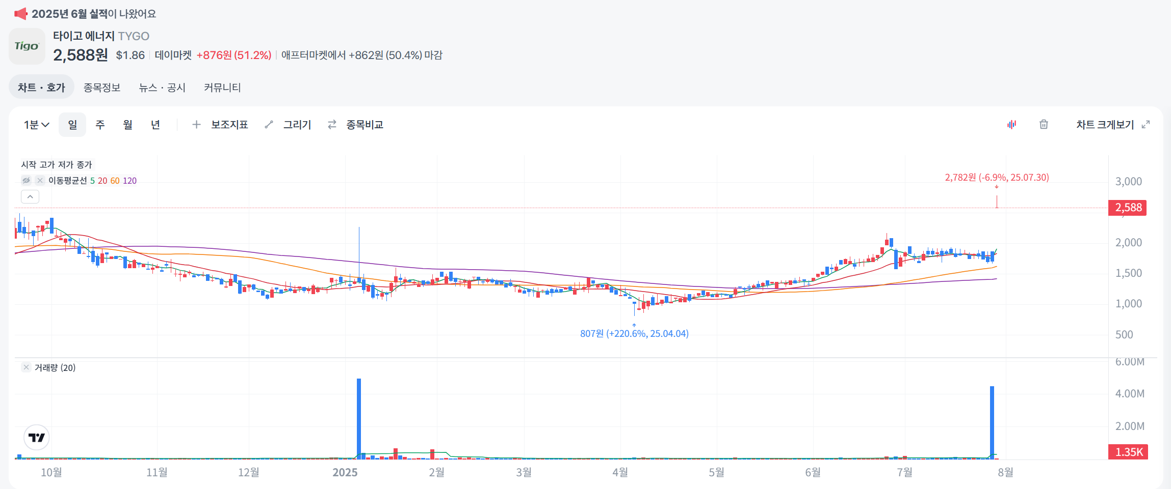 2025년 7월 기준, 타이고 에너지(TYGO)의 주가는 약 $1.50~$2.00 수준으로, 변동성이 큰 소형주로 분류됩니다. 2023년 상장 이후 주가는 초기 공모가($11) 대비 하락세를 보였으나, 최근 태양광 시장의 성장과 함께 회복 가능성을 보이고 있습니다.