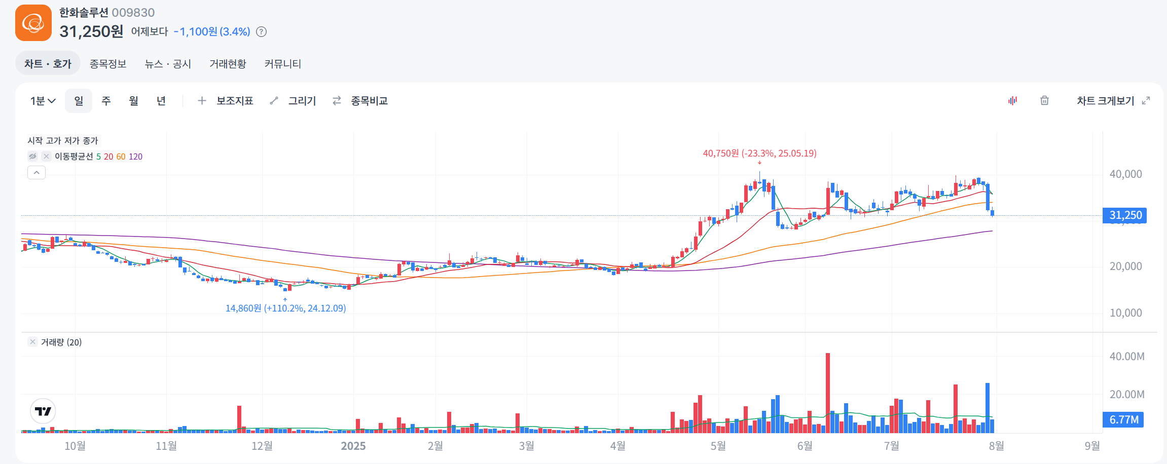 2025년 7월 기준, 한화솔루션 주가는 50일 SMA(36,500원) 위에서 거래되며 RSI(58.2, 중립)로 단기 상승세를 보입니다. 하나증권은 목표주가를 50,000원으로 상향 조정하며, 태양광 수요와 정책 모멘텀을 긍정적으로 평가했습니다. 그러나 유안타증권은 26,000원의 보수적 목표주가를 유지하며 재무 부담을 지적했습니다. 단기 투자자는 미국 태양광 모듈 가격 반등과 3분기 실적(10월 발표 예정)을 주시하며 35,000~37,000원 구간에서 분할 매수를 고려할 수 있습니다. 장기 투자자는 솔라허브 가동률 상승과 IRA 정책 변화 여부를 모니터링해야 합니다. MK News Infostockdaily