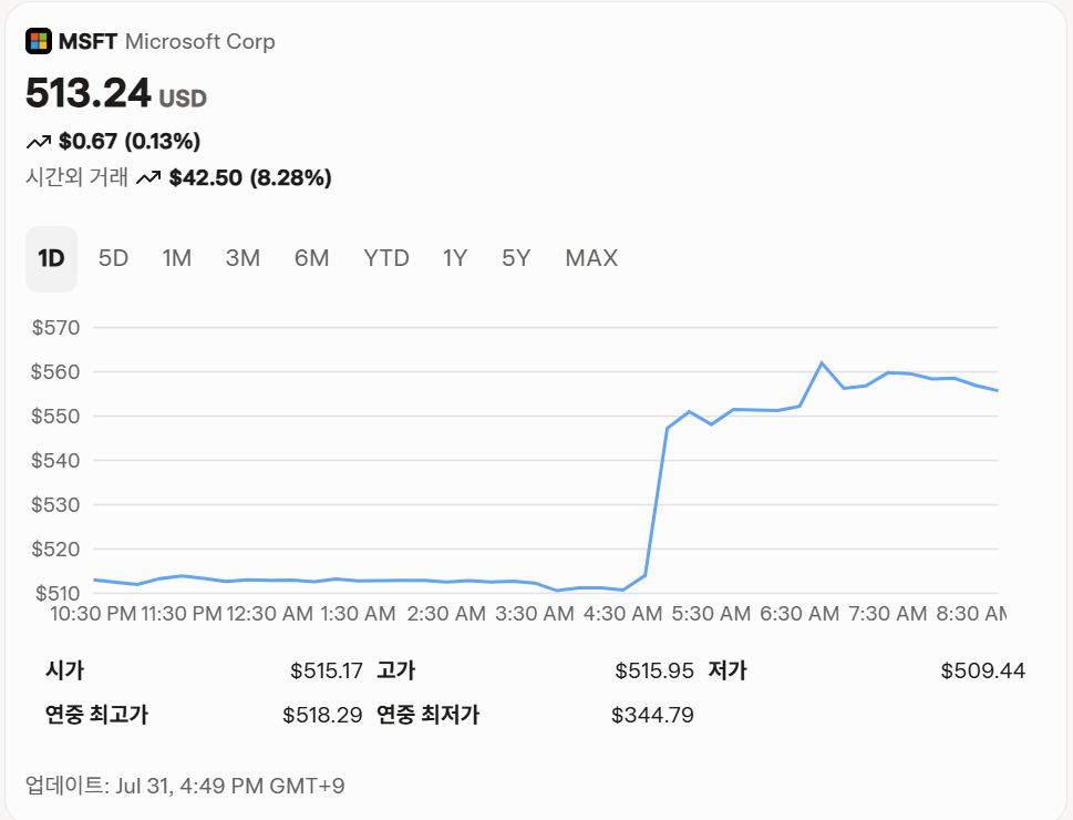 2025년 회계연도 4분기(2025년 7월 30일 발표) 매출은 2817.2억 달러(전년 대비 14.93% 증가), 순이익은 1018.3억 달러(15.54% 증가)를 기록하며, Azure의 20% 이상 성장과 AI 수요가 실적을 견인했습니다. 2025년 7월 30일 종가 기준 주가는 513.24달러(하루 0.03% 상승, 연초 대비 19% 상승)로, 52주 범위(344.79~518.29달러) 상단에 위치합니다. P/E 비율은 33.3배로 역사적 평균(30배)보다 높으며, 배당수익률은 0.67%입니다. Yahoo Finance StockAnalysis