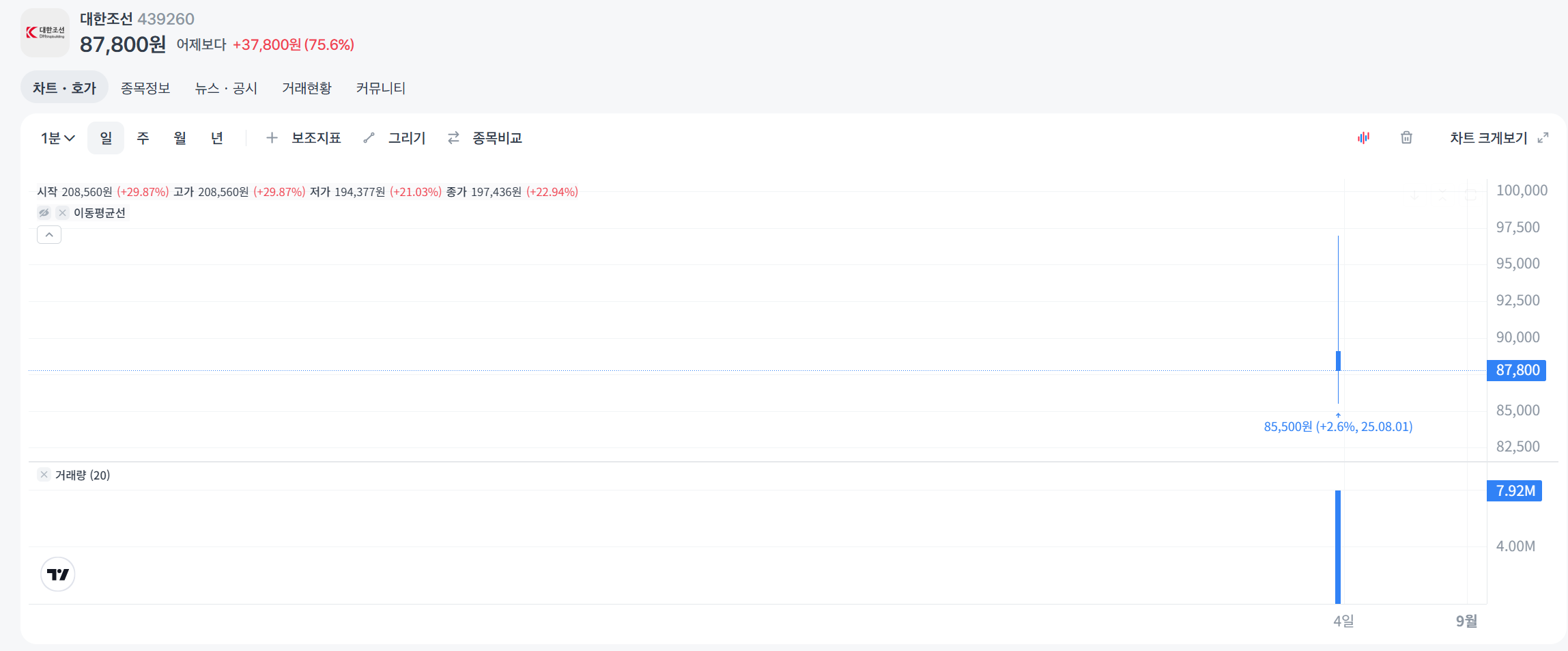 주가 동향: 2025년 7월 기준, HD한국조선해양의 주가는 약 205,000원으로, 최근 1년간 약 40% 상승하며 강세를 보였습니다. 시가총액은 약 14.5조 원으로, 글로벌 조선 시장의 회복과 함께 긍정적인 전망을 받고 있습니다.