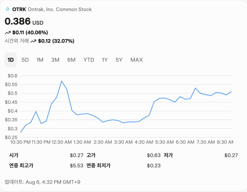 2025년 8월 3일 기준, Ontrak, Inc. (OTRK)의 주가는 약 $0.31로, 지난 24시간 동안 +1.47% 상승했습니다. 52주 최고가는 $5.53, 최저가는 $0.23으로, 높은 변동성을 보입니다. 시가총액은 약 $130만으로, 소형주에 속하며 유동성이 낮습니다.