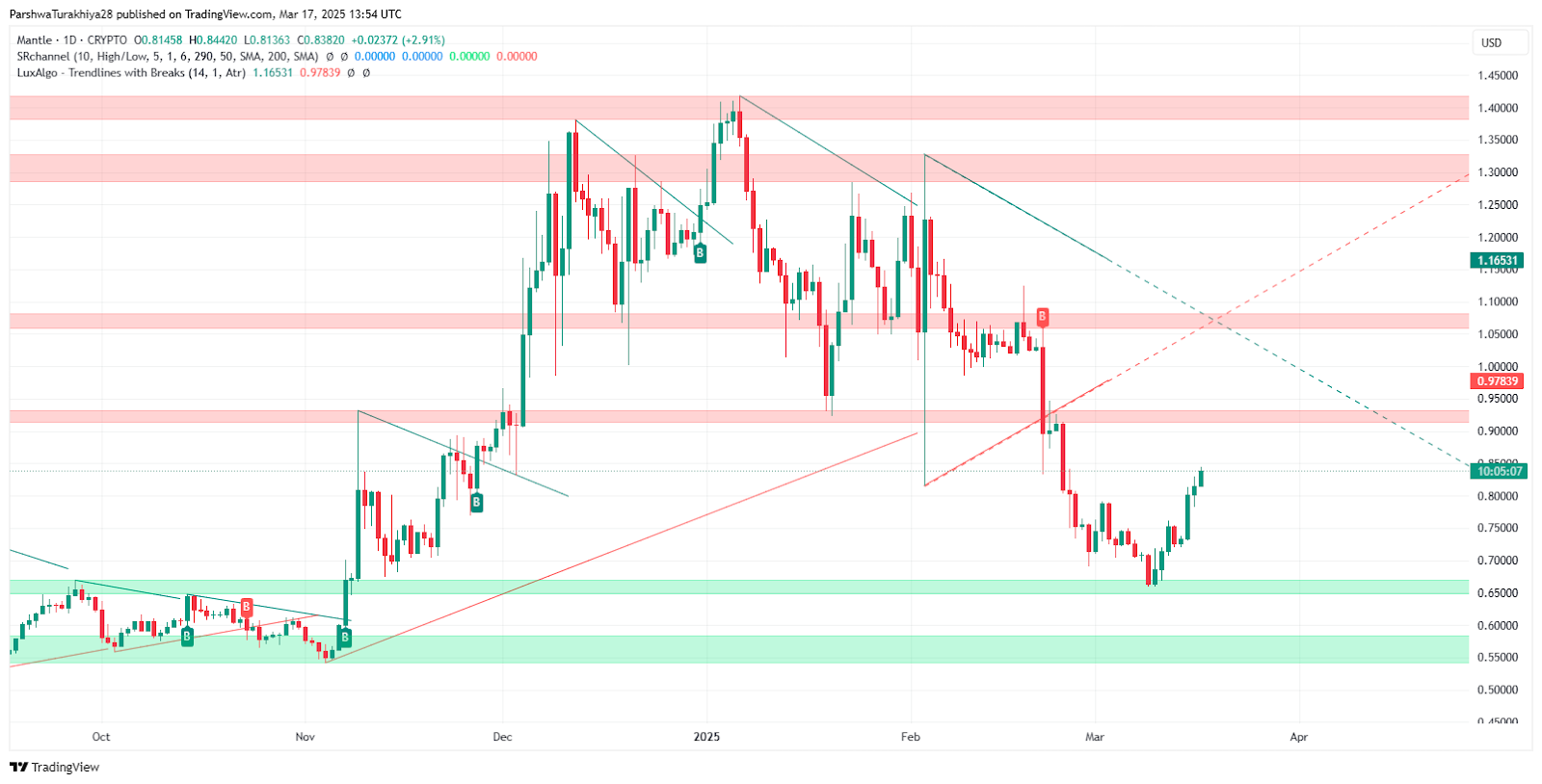 $0.90, MNT/BTC 0.00000530.0000085(). - 단기 전망: RSI 68.42로 단기 조정 가능, 2025년 9월까지 $1.38