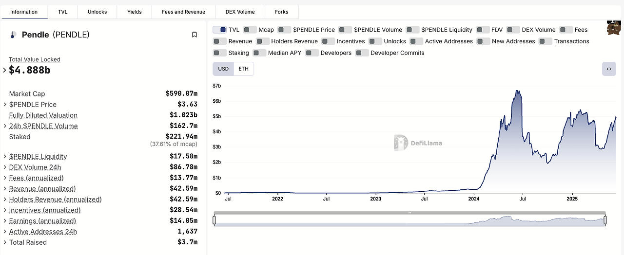 Pendle은 미래 수익률 거래와 비트코인 DeFi(BTCFi) 확장으로 DeFi 시장에서 독보적인 위치를 차지하고 있습니다: