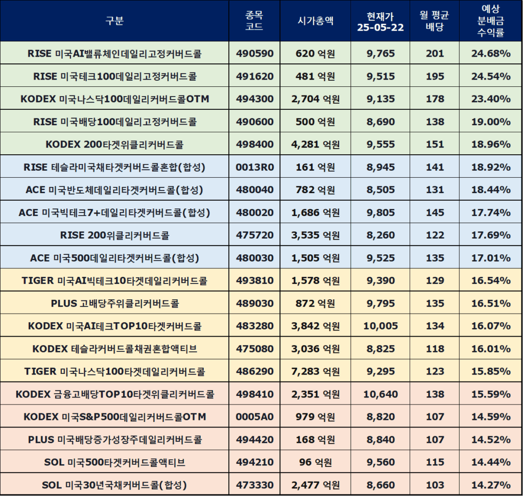 ETF 이름주식 코드시가총액현재 가치월 평균 배당금예상 연간 수익률