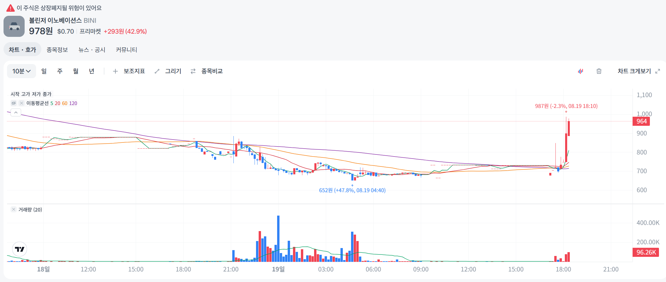 - 거래량: 8월 18일 약 1,557,099주, 10일 평균 600만 주, 최근 변동성으로 거래량 급등.