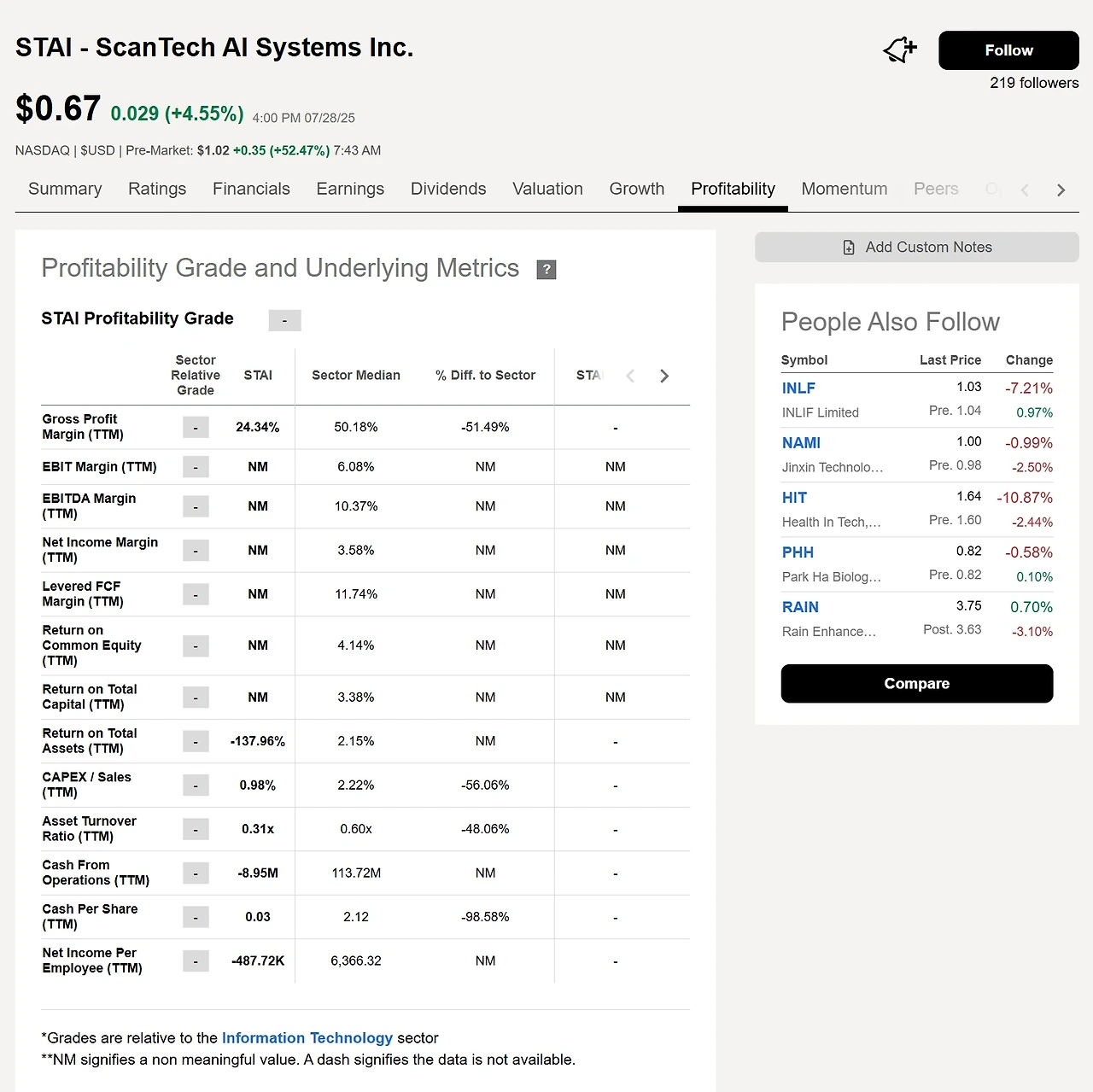 안녕하세요, 투자자 여러분! 오늘은 AI 기반 스캔 기술 전문 기업 Scantech AI Systems Inc. (NASDAQ: STAI) 주식에 대해 분석하겠습니다. Scantech AI는 AI와 머신 비전을 활용한 검사 및 보안 시스템을 개발하며, 산업 및 보안 분야에서 주목받고 있습니다. 이 보고서는 2025년 8월 20일 기준 최신 데이터를 바탕으로 STAI 주가, 최근 동향, 성장성, 투자 전망을 다룹니다. 투자 전 DYOR하세요!
