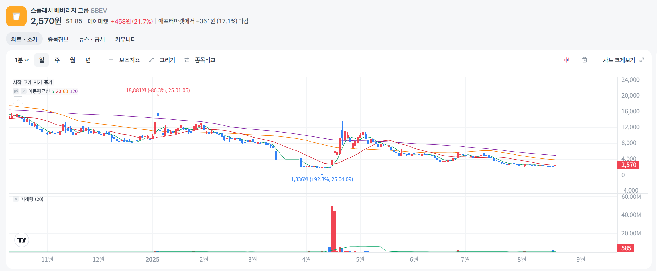 2025년 8월 20일 기준, 스플래시 베버리지 그룹 (SBEV) 주식 현황은 다음과 같습니다: