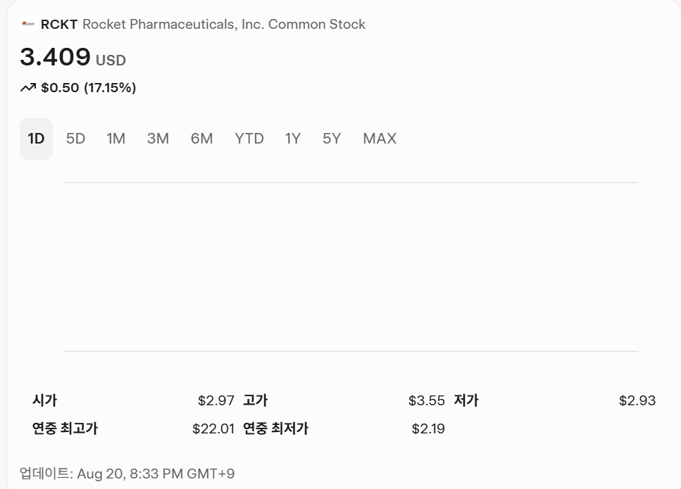 2025년 8월 20일 기준, 로켓 파마슈티컬스 (RCKT) 주식 현황은 다음과 같습니다 (상단 finance card 참고):