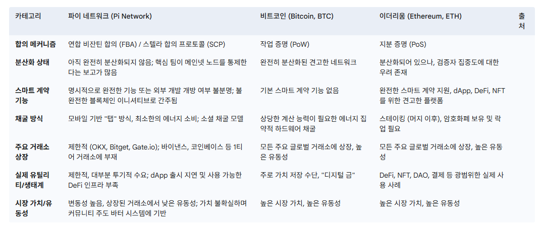 다음은 파이 네트워크를 주요 암호화폐인 비트코인 및 이더리움과 비교한 표입니다.