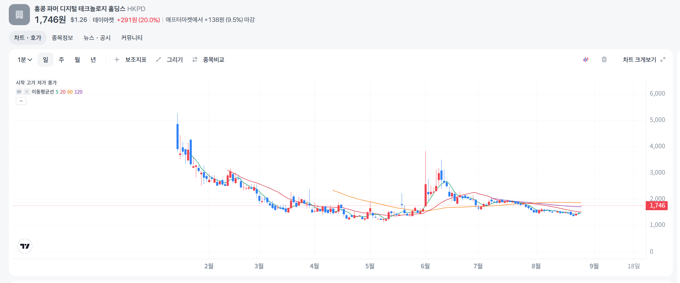 2025년 8월 26일 기준, 홍콩 파마 디지털 테크놀로지 홀딩스 (HKPD) 주식 현황은 다음과 같습니다: