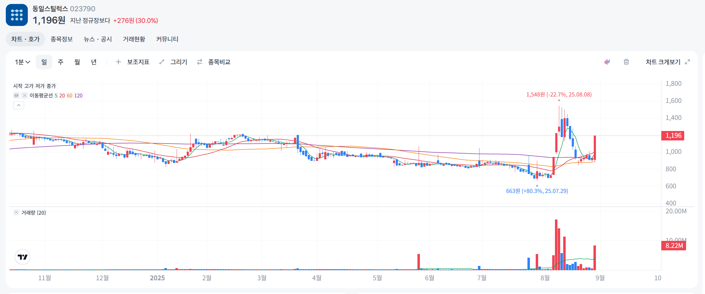 2025년 8월 27일 기준, 동일스틸럭스 주식 현황입니다:
