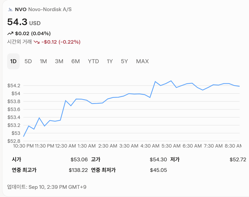 2025년 주가는 경쟁사(일라이 릴리)와의 경쟁, 웨고비(Wegovy) 제네릭 승인, CEO 교체 등으로 큰 변동성을 보였습니다. 한국 투자자는 키움증권, 삼성증권 등 해외주식 거래 플랫폼을 통해 접근 가능하며, 거래 수수료(약 0.1~0.25%)와 환전 비용을 고려해야 합니다.