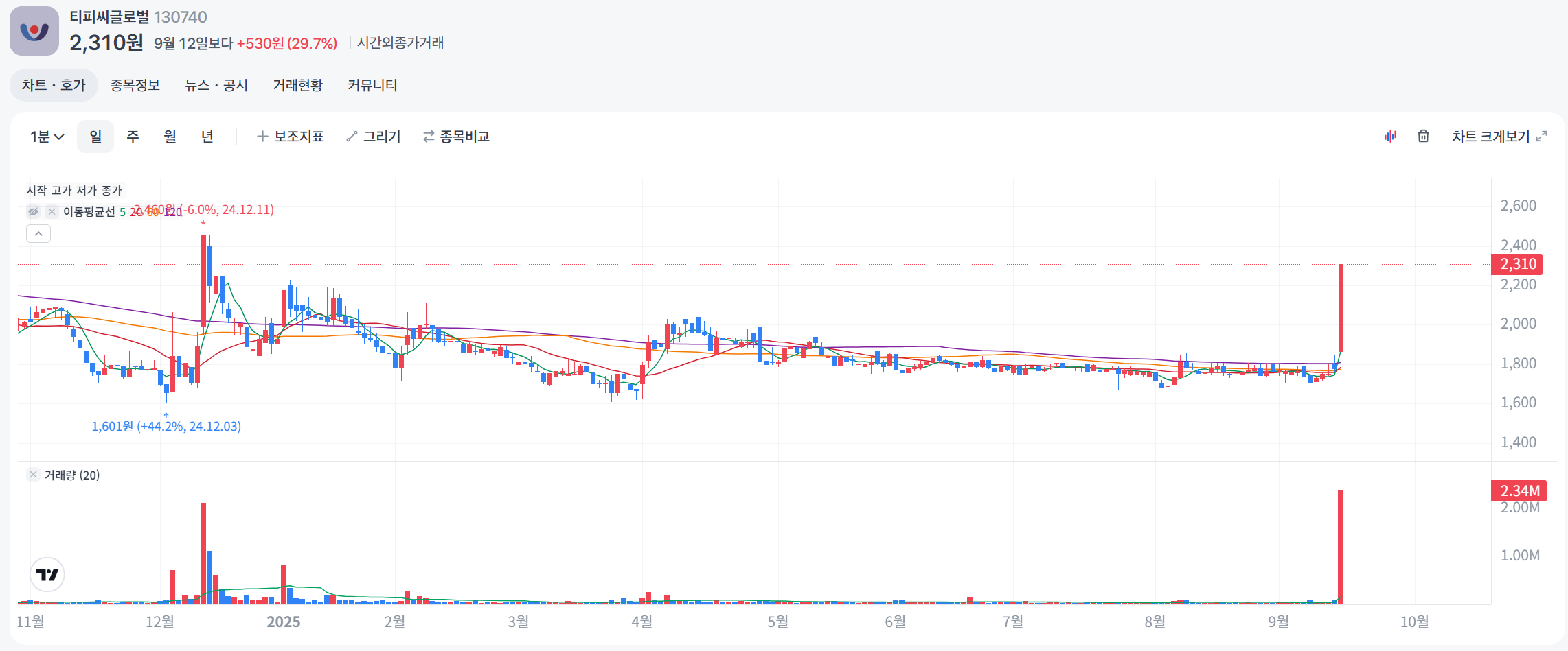 - 종목명: 티피씨글로벌 (130740 / KOSDAQ)