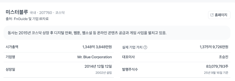 📚 미스터블루(207760) 기본 정보 (초보자도 알기 쉽게)