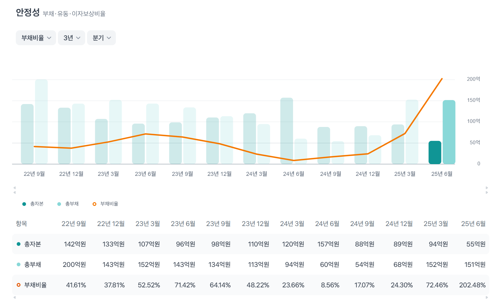| 부채비율 (Debt-to-Equity) | 202.48% | 부채 높아 리스크. |