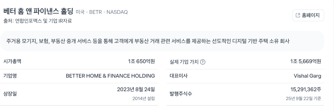 베터 홈 앤 파이낸스 홀딩(Better Home & Finance Holding Company, 티커: BETR)은 미국 나스닥 상장 디지털 주택 소유 플랫폼으로, AI 기반 기술을 활용해 모기지 산업을 혁신하고 있습니다. 원래 Better.com으로 시작된 이 회사는 주택 대출, 재융자, 주택 담보 상품을 소비자와 기관 파트너에게 직접 제공합니다. 2025년 9월 22일 기준 시가총액은 약 7억 6,426만 달러로, 최근 12개월 매출은 1억 3,067만 달러입니다. 높은 운영 비용과 시장 도전으로 인해 아직 손실이 지속되고 있지만, 2025년 2분기 자금 조달 대출 규모가 전년 대비 25% 증가한 12억 달러를 기록했고, 주택 담보 상품은 166% 성장하며 고객이 1억 9,300만 달러 이상의 부채를 상환하도록 도왔습니다. 회사는 AI를 활용해 15조 달러 규모의 모기지 시장을 재편하려 하지만, 높은 부채와 수익성 부족으로 리스크가 큽니다.