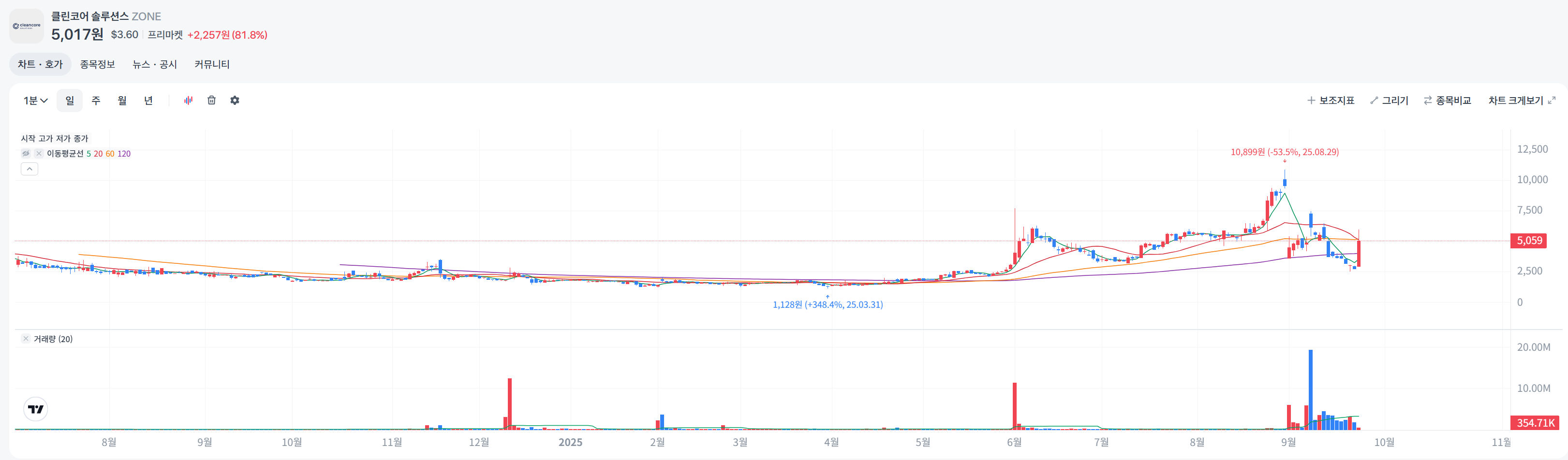 2025년 6월 24일부터 9월 24일까지 ZONE 주가는 클린테크 시장 약세와 크립토 연동으로 큰 변동성을 보였습니다. 6월 말 약 4.50달러 수준에서 시작해 7월 실적 기대감으로 5.00달러대를 유지했으나, 8월 28일 사상 최고가 7.82달러를 찍은 후 9월 초 시장 조정으로 3.66달러까지 하락했습니다. 9월 16일 DOGE 트레저리 확대 발표로 반등해 3.00달러를 회복했지만, 9월 22일 -9.65% 급락하며 2.06달러로 마감했습니다. 전체적으로 3개월간 -50% 이상 하락했으나, 최근 DOGE 상승으로 회복 조짐이 보입니다. 이는 소형주 특유의 뉴스·테마 반응 패턴입니다.
