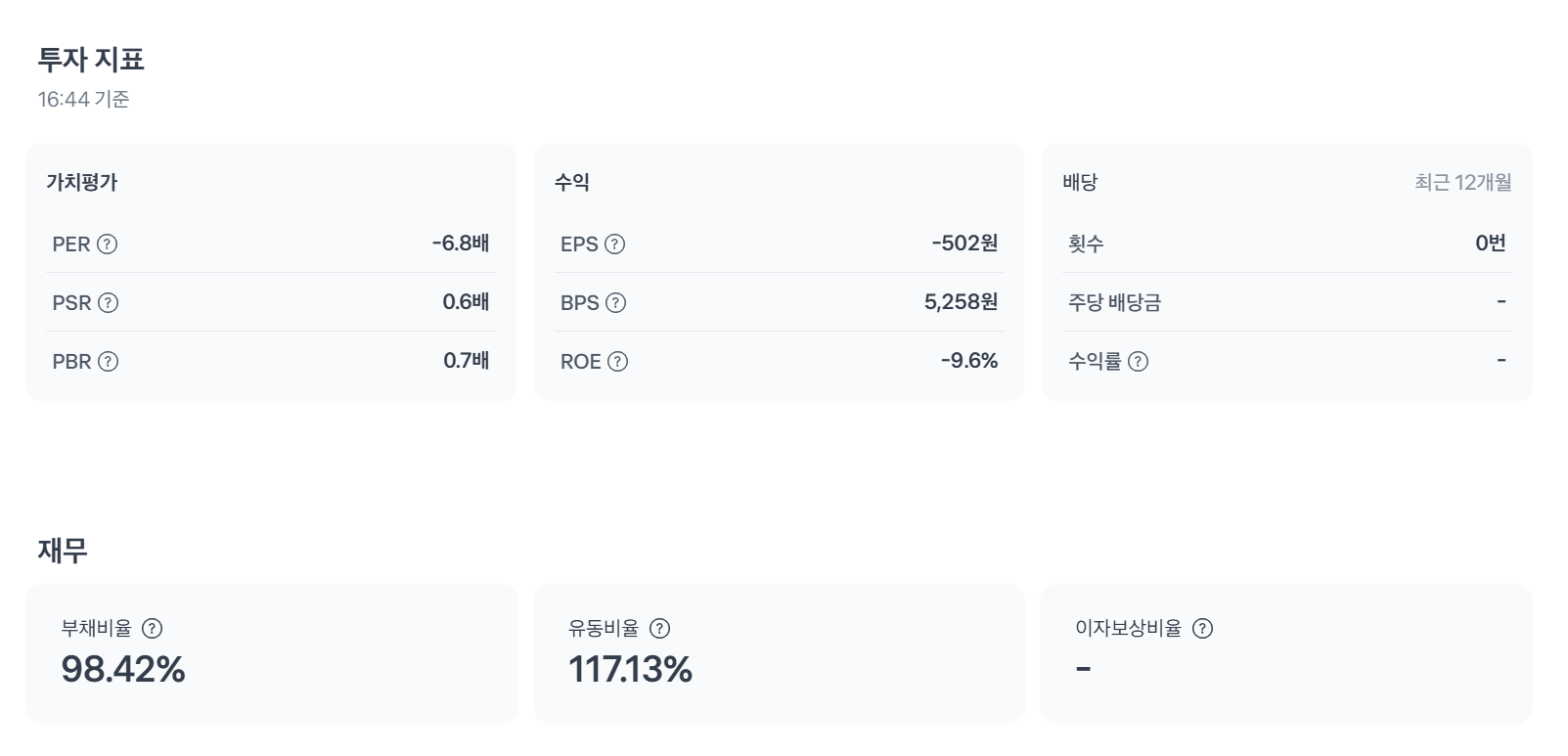 | EPS (1주당 순이익) | -0.38 | 주당 손실. 흑자 전환 시 상승 요인. |