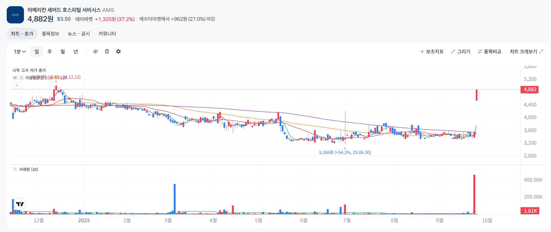 2025년 6월 25일부터 9월 25일까지 AMS 주가는 시장 불안정과 실적 발표로 변동성을 보였습니다. 6월 말 약 2.80달러 수준에서 시작해 7월 실적 기대감으로 3.00달러대를 유지했으나, 8월 경제 둔화 우려로 2.16달러까지 하락했습니다. 9월 들어 Q2 실적 발표(매출 증가)와 보험 정산 소식으로 반등, 9월 22일 2.45달러에 마감했습니다. 전체 3개월간 -12% 정도 하락했으나, 최근 뉴스로 회복 조짐이 보입니다. 이는 소형주의 뉴스 민감성 패턴입니다.