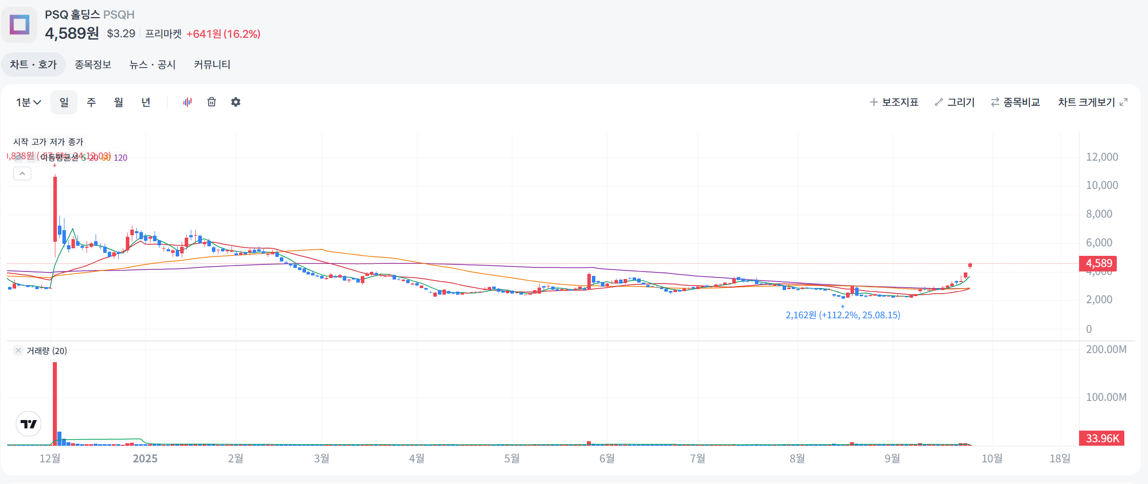 차트 설명: 상상해 보세요 – 6월부터 완만히 오르던 선이 8월에 '바닥'으로 곤두박질치고, 9월에 'V자 반등'하는 모양! 실제 차트는 TradingView에서 'PSQH 3M' 검색해 보세요. 초보 팁: 이런 변동은 뉴스에 민감하니, 매일 체크하지 말고 주간으로 보세요.