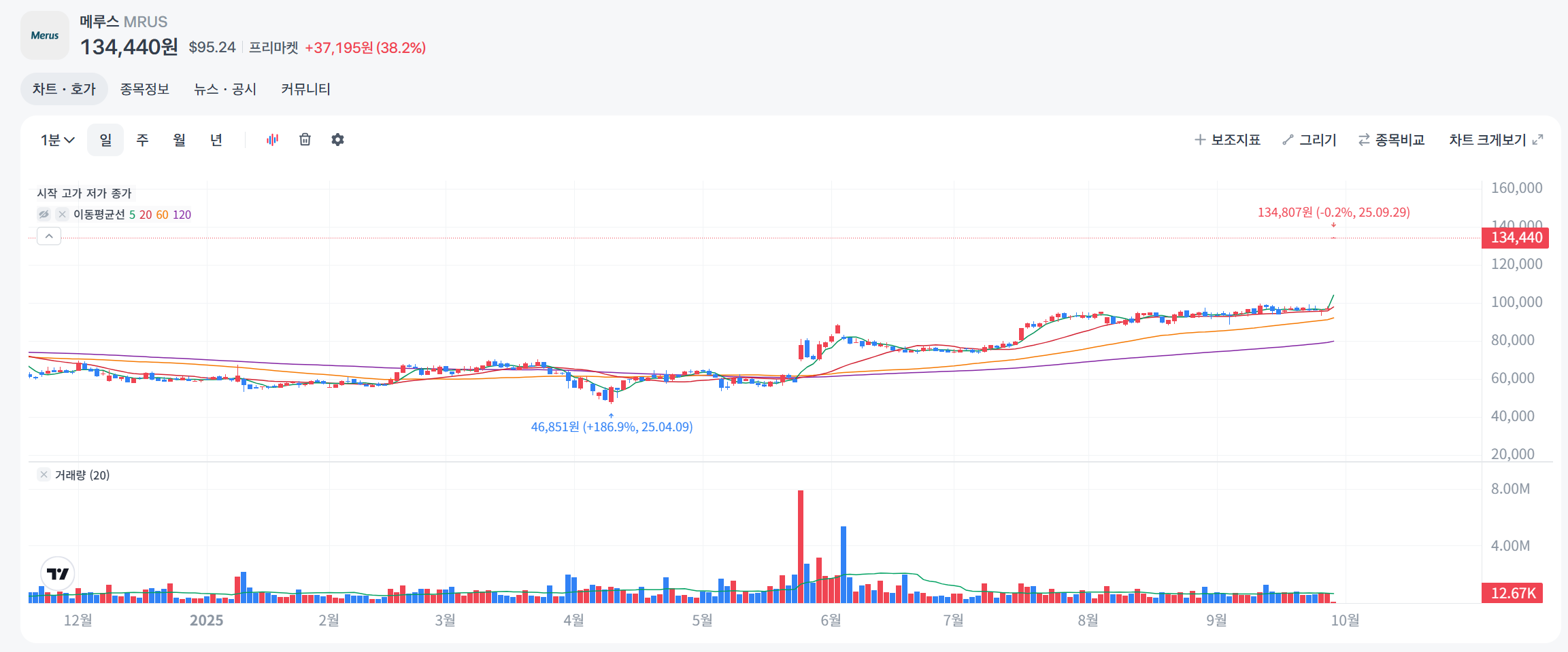 차트 설명: 5월 ASCO 데이터로 V자 반등, 9월 ATH! 실제 차트는 TradingView 'MRUS 6M' 검색하세요. 초보 팁: RSI 과매수(70 근처)로 조정 가능, 주간 차트로 확인!