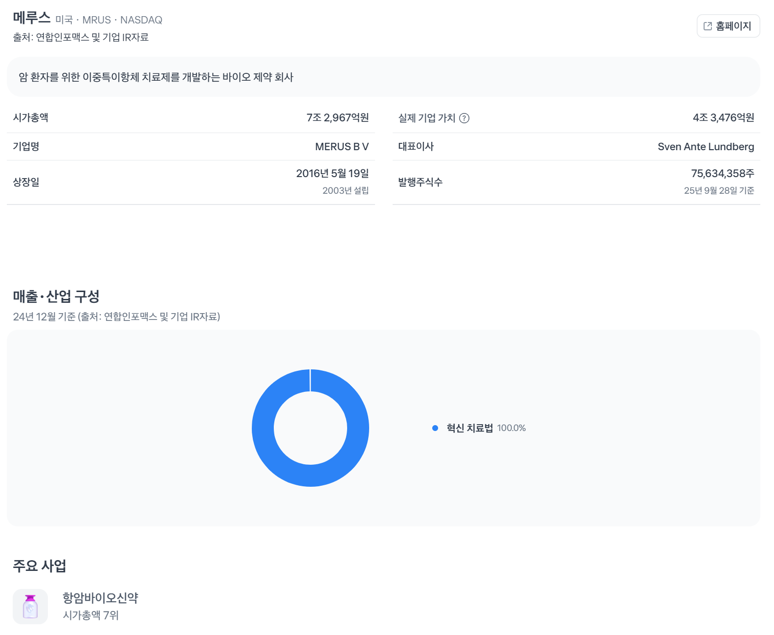 MRUS는 임상 단계 바이오주로 적자지만, 매출 성장세예요. 초보자 여러분, PER 음수는 'R&D 투자 중' 신호예요. 현금 $0.73M로 단기 안정.