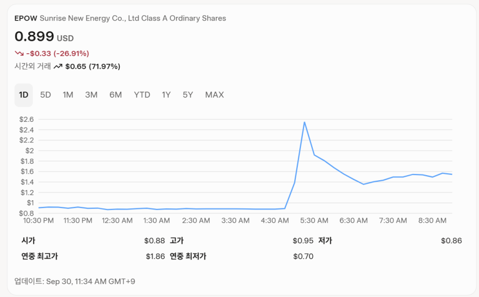 EPOW 주가는 2025년 7월부터 9월 말까지 변동성이 큰 흐름을 보였습니다. 7월 초 약 0.885달러에서 시작해 9월 초 0.79달러까지 하락 후, 9월 말 1.546달러로 급등(+74.7%)했습니다. 특히 9월 29일 장 마감 후 79.1% 급등하며 1.61달러를 기록, 이는 미국 특허 획득과 1GW 배터리 공장 발표로 인한 투자자 기대감 때문입니다. 그러나 여전히 장기적으로는 변동성이 높아 주의가 필요합니다.