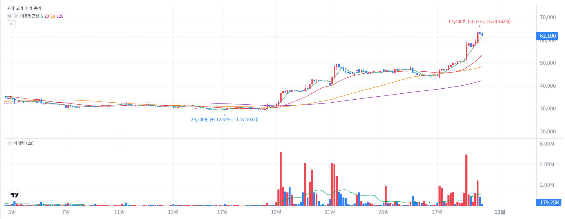 - 종가: 63,000원 (전일 대비 +26.13%)